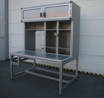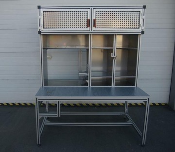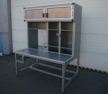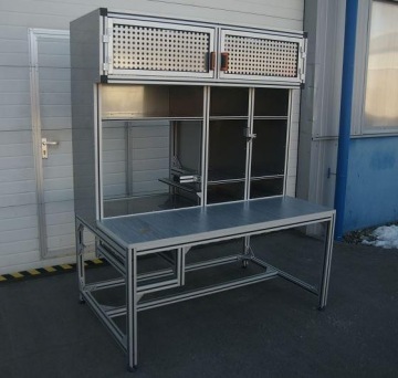 Stůl operátora ve výrobní hale o rozměrech: 1600 x 2045 x 1000 mm (Š x V x H). Provedení dle standardů ESD se zaslepenými pohledovými drážkami. Konstruován pro kontrolu a úpravu tištěných spojů, ke které se budou používat pájky s jejich zdroji, mikroskop a měřící zařízení.